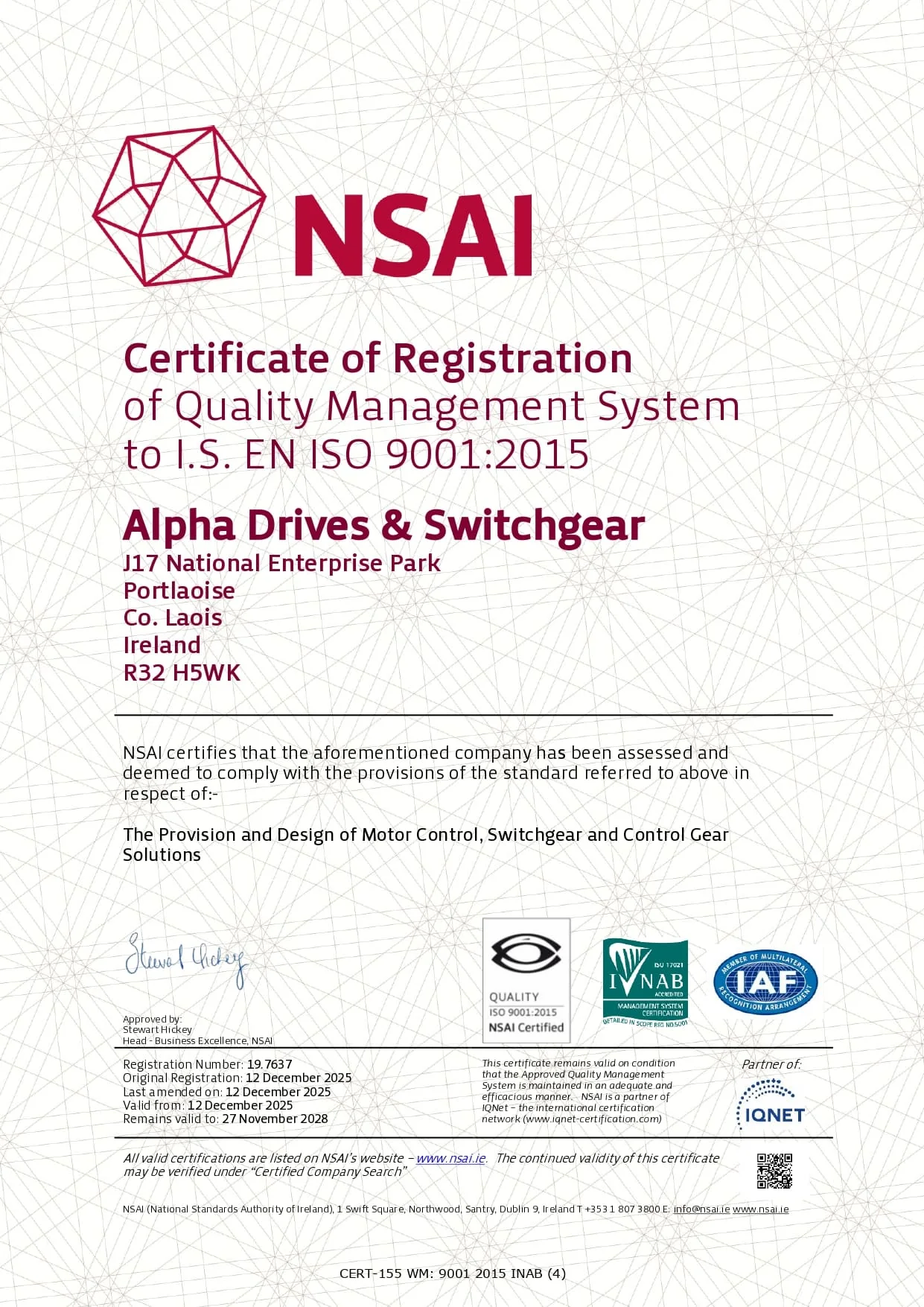 Alpha Drives & Switchgear is certified to ISO 9001, the internationally recognised standard for Quality Management Systems, by NSAI (National Standards Authority of Ireland).