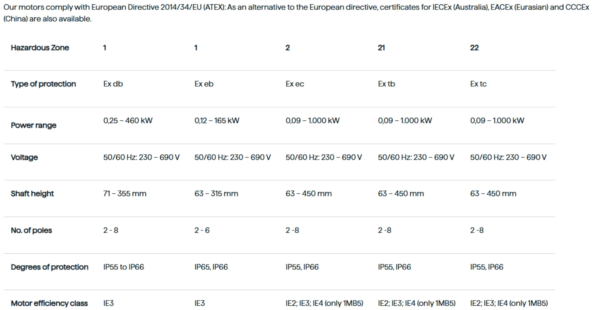Motors with flameproof Ex db IIC protection are optional and work well for compressor applications as well as pumps and fans. They are the best in class when used with any frequency converter in the power range of 0.09 to 460kW, and they can be used on the mains or alternatively.